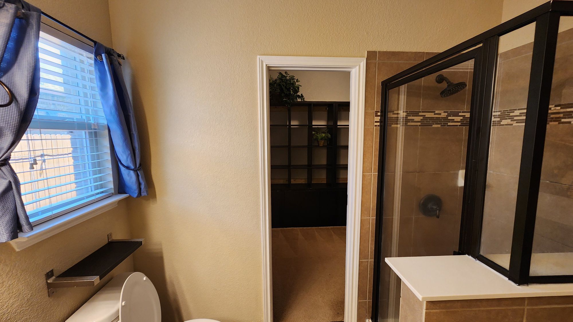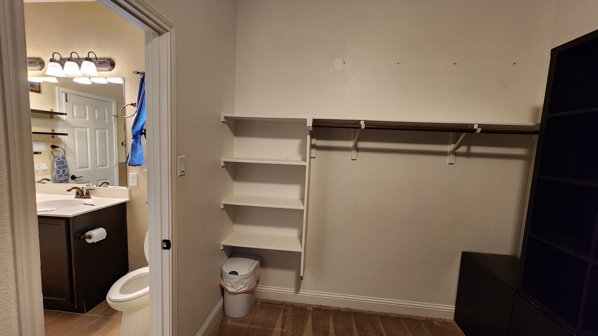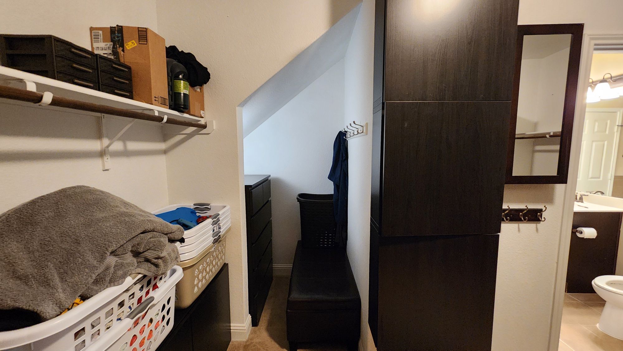 Walk in closet looking out to the toilet area